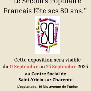 À cette occasion, nous avons le plaisir de vous inviter à découvrir l’exposition « Le Secours Populaire Français fête ses 80 ans », visible du 11 au 25 septembre 2025 au Centre Social de Saint-Yrieix-sur-Charente (L’esplanade...